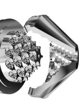 FDM is a concentric rotor-stator system with indentations or cavities machines into the rotor and stator surfaces (Fig. A). The rotor and stator are based on a stepped conical form so that the diameter of the cone increases from inlet to outlet. The cavities in the rotor and stator are typically spherical segments which are open on both vertical and horizontal faces.